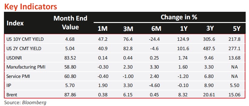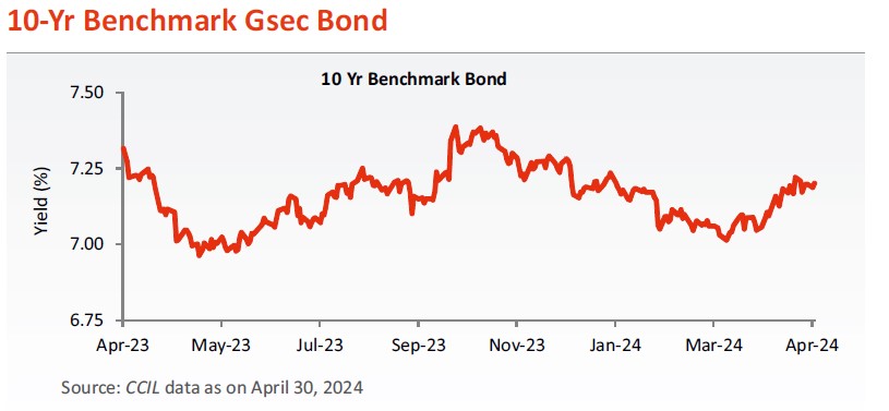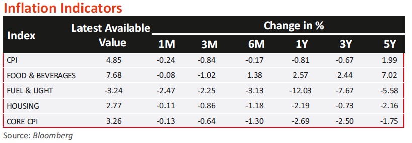 • CPI (retail inflation) in March 2024 fell to a ten-month low of 4.85% (5.09%. in February 2024), the lowest since May 2023 when it recorded 4.31%. The latest inflation reading indicates a continuing downward trend in consumer prices. Food inflation slightly decreased to 8.52% from 8.66% last month. The central bank forecasts CPI inflation at 4.5% this fiscal year. Although remaining within the RBI's 2%-6% acceptable range for seven months, it has exceeded the 4% medium-term target for 54 consecutive months.
