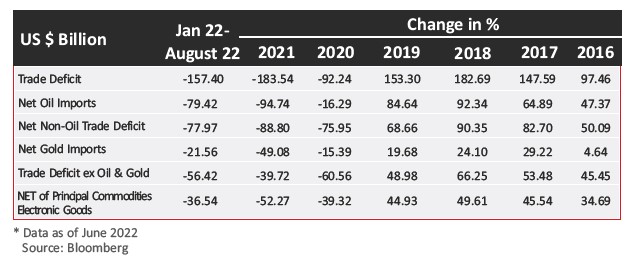 India's exports rose by 2.14% to USD36.3bn in July 2022 (23.5% in June 2022) while trade deficit almost tripled (YoY) to USD30bn during the month. Imports surged by 43.6% YoY to USD66.3bn in July 2022. Trade deficit was USD10.6bn in July 2021.
