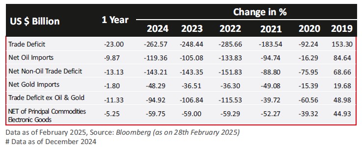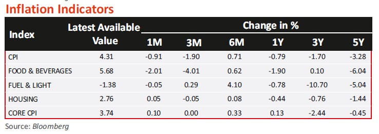 - India's CPI inflation fell to a five-month low of 4.31% in January 2025 as prices of vegetables and pulses eased, bringing respite to household budgets. The easing of inflation reflects a steadily declining trend after reaching a 14-month high of 6.21% in October 2024. CPI inflation had fallen to 5.48% in November 2024 and 5.22% in December 2024. Food inflation, at 6.02% in January 2025, is the lowest since August 2024. Support from fiscal and monetary policy is to narrow the negative output gap; unlikely to increase demand side inflation materially in FY26 and beyond. Tax cuts of INR 1trn, higher momentum of capital expenditure in FY26, and an effective monetary policy easing of about 75bps should be enough, in our view, to support a non-inflationary real GDP growth in of 6.5-7.0%.