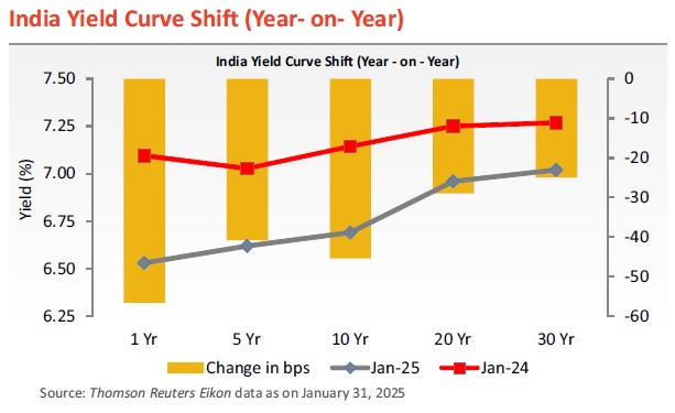 - GST collections for January 2025 rose 12.3% year-on-year to Rs 1.96 lakh crore (Rs 1.76 lakh crore in December 2024). Year-to-date collections scaled to Rs 16.33 lakh crore, marking a 9.1% rise from the previous year but falling 18.98% short of the fiscal 2024 target.