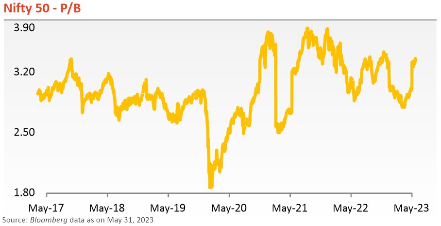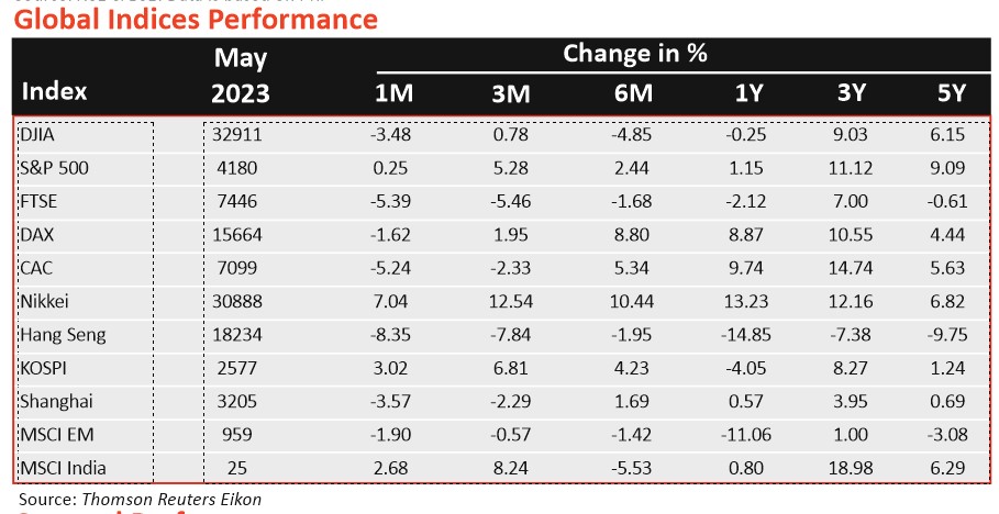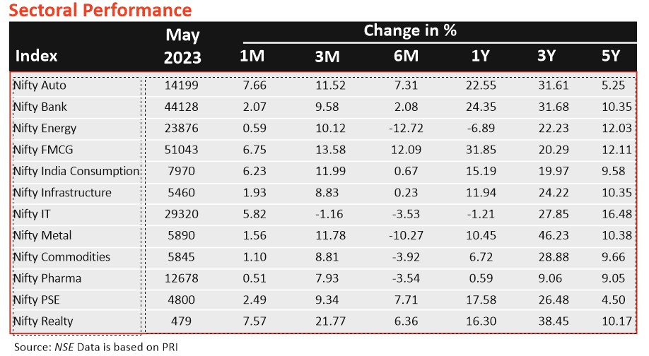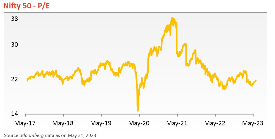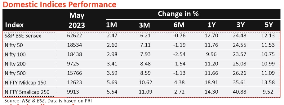 Markets sustained the rally in May 2023 on the back of strong FII buying (Rs 43,838 crores) even as DIIs turned (net) sellers to the tune of Rs 3,306 crores. While there was no formidable rallying point, lower-than-expected inflation, a pause on rate hikes, absorption of full year’s earnings and encouraging performance of certain sectors, continue to showcase India as a bright spot in emerging markets.