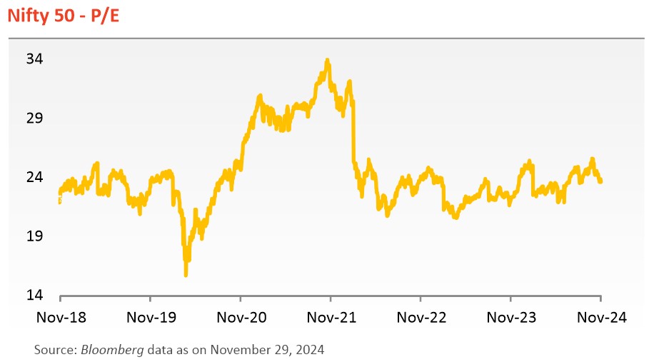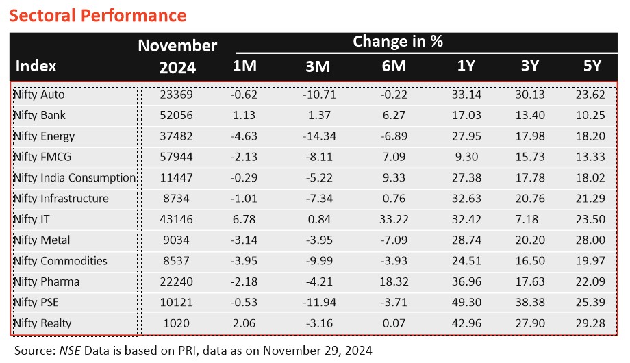 - Equity markets in November 2024 were influenced by quarterly results and the US presidential elections. Factors like low government spending, elections, and a weak monsoon dampened market sentiment.