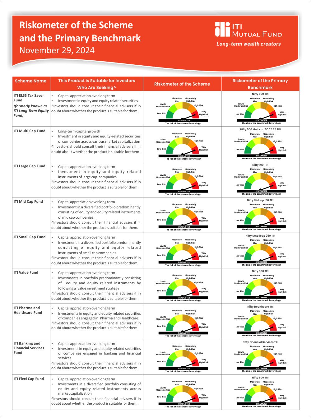 Past performance may or may not be sustained in future and is not a guarantee of any future returns, and should not be used as a basis of comparison with other investments. The performance data for 5 years period has not been provided, since scheme is in existence for less than 5 years. In case, the start / end date of the concerned period is a non-business date (NBD), the NAV of the previous date is considered for computation of returns. Different Plans i.e. Regular Plan and Direct Plan under the scheme have different expense structure. Benchmark: Nifty 500 Multicap 50:25:25 TRI Additional Benchmark: Nifty 50 TRI. Fund Managers: Mr. Dhimant Shah (Managing since 08-August-2022) and Mr. Rohan Korde (Managing Since 01-December-2022) Inception date of the scheme (15-May-19). Face Value per unit: Rs. 10. ITI Multi Cap Fund NAV as on November 29, 2024: Rs. 23.5519 (Regular Growth Option), Rs. 26.3381 (Direct Growth Option)