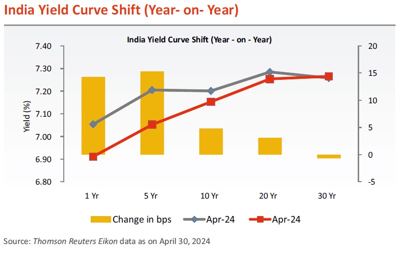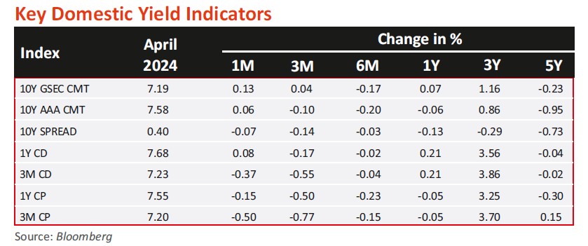 • CPI (retail inflation) in March 2024 fell to a ten-month low of 4.85% (5.09%. in February 2024), the lowest since May 2023 when it recorded 4.31%. The latest inflation reading indicates a continuing downward trend in consumer prices. Food inflation slightly decreased to 8.52% from 8.66% last month. The central bank forecasts CPI inflation at 4.5% this fiscal year. Although remaining within the RBI's 2%-6% acceptable range for seven months, it has exceeded the 4% medium-term target for 54 consecutive months.