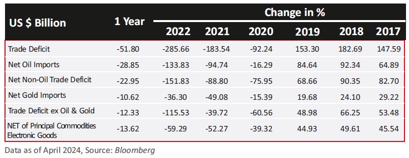 • The country’s merchandise exports decreased to USD437.1bn. In contrast, services exports expanded by 4.4%, scaling a record high of USD339.6bn, up from USD325.3bn the previous year. The services sector also saw a decline in imports, dropping by 2.46% to USD177.6bn from USD182.1 bn in FY23. This performance highlights an expansion in services exports alongside a reduction in imports for the year.