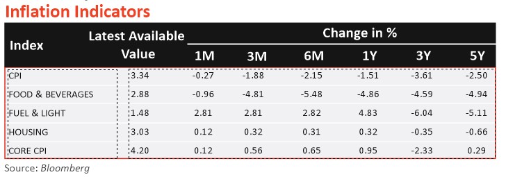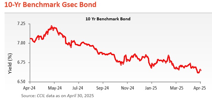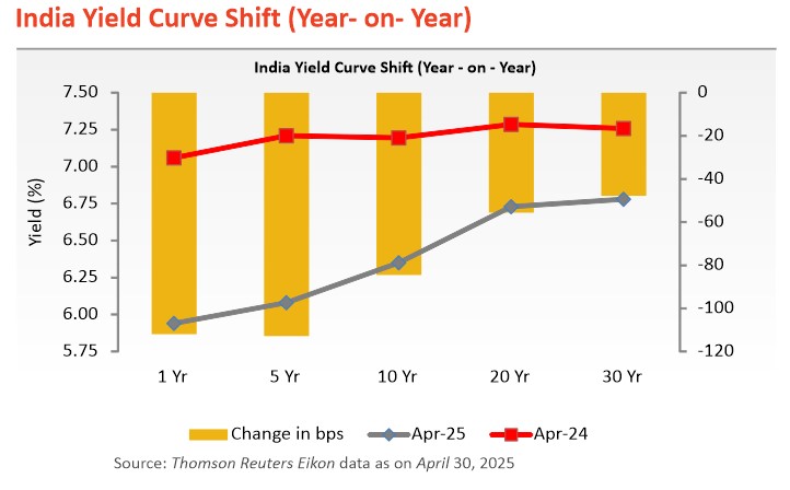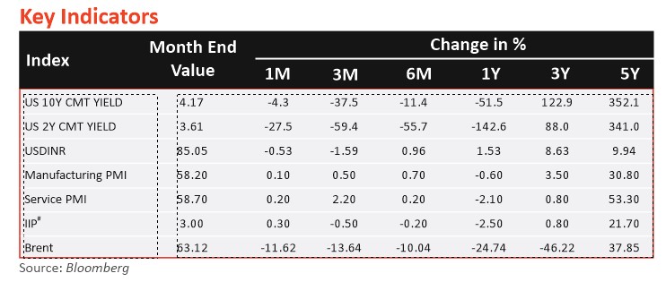 - Retail inflation (CPI) cooled to a 67-month low of 3.34% in March 2025 (to 3.61% in February 2025), helped by softening food prices. This is the second month retail inflation stayed below the RBI's 4% target. For FY25, inflation averaged 4.6%, down from 5.4% in FY24.