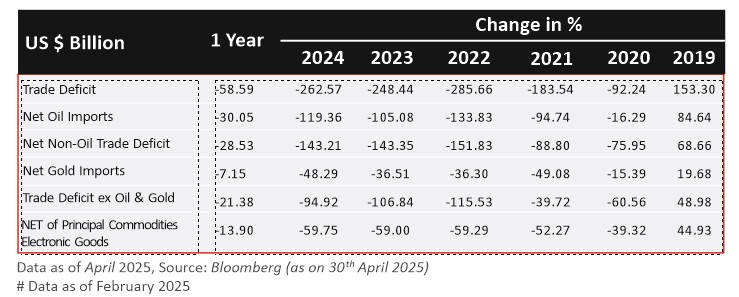 - March 2025 saw India's exports inch up 0.7% to USD 41.97 bn, with imports surging 11.3% to USD 63.51 bn, pushing the trade deficit to USD 21.54 bn. In FY24, exports were flat at USD 437.42 bn, while imports rose 6.62% to USD 720.24 bn. Total goods and services exports grew 5.5% to USD 820.93 bn.