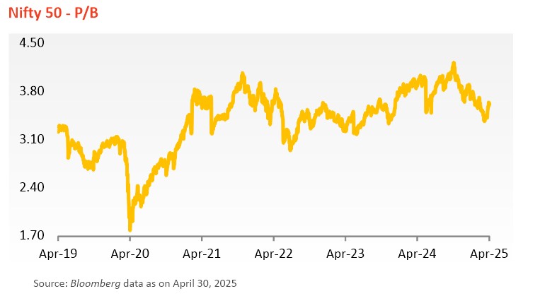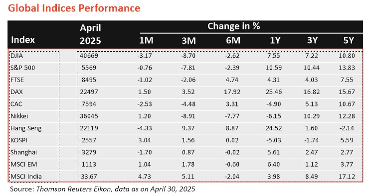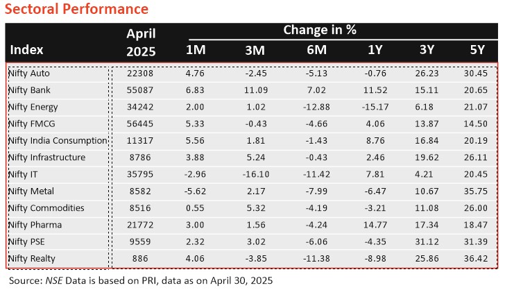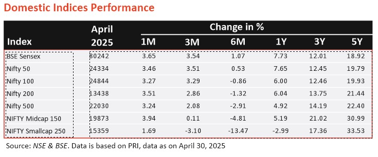 - April 2025 saw markets posting a modest rebound, driven by appealing valuations and a reduced risk of tariff hikes. The BSE Sensex advanced by 3.65%, while the Nifty 50 posted a 3.46% gain. Similarly, mid and small-cap indices also moved higher, with the BSE Midcap rising 3.26% and the BSE Small cap increasing by 1.63%.