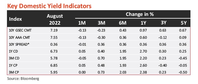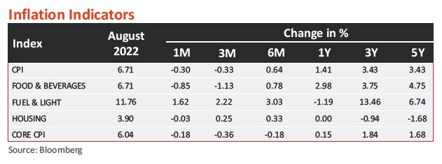 Retail inflation eased to a 5-month low of 6.71% in July 2022 (7.01% in June 2022). Notwithstanding the downtrend in CPI, this is the seventh successive month retail inflation has exceeded the RBI’s upper tolerance limit of 6%. In a bid to check inflation, the Monetary Policy Committee (MPC) of the RBI had hiked the repo rate by 50 basis points to 5.40%.