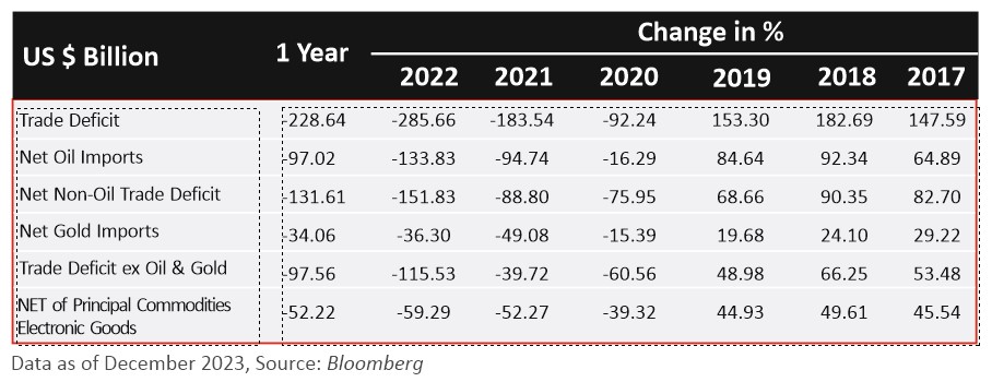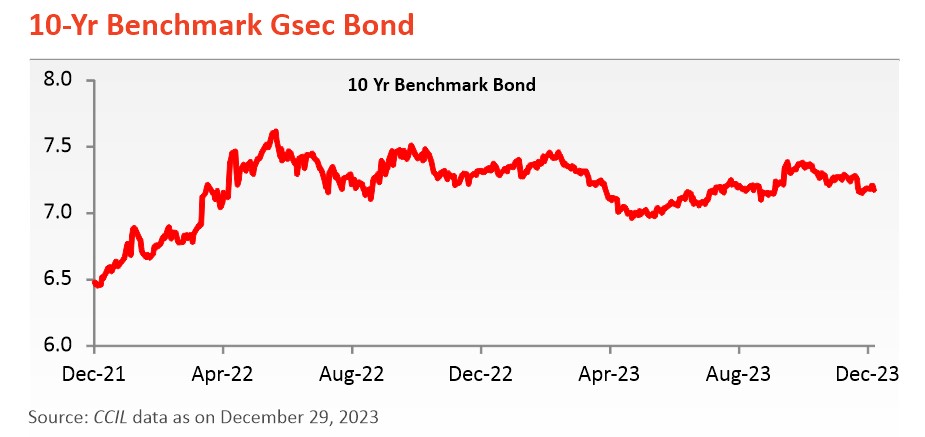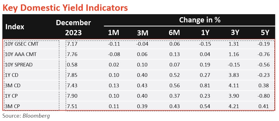 • The US Fed expectedly held the benchmark rate in the 5.25% - 5.5% target range in the FOMC meeting in December 2023, and importantly projected 75 bps (100 bps = 1.0%) of rate cuts in 2024. Furthermore, though the Fed decided to continue with the pace of quantitative tightening (QT), the FOMC minutes indicated discussions on when to flag the balance sheet change.
