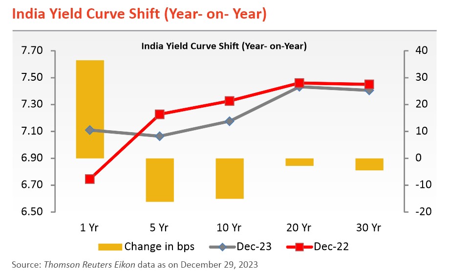 • The RBI expectedly kept the repo rate as well as the policy stance unchanged at the December 2023 MPC meeting. The tone of the MPC was balanced with the focus on the need to sustain the disinflation path to ensure a durable alignment of CPI to the 4.0% inflation target being partly offset by cautioning the risk of overtightening, especially when large structural changes, geopolitical and geoeconomic shifts are taking place.