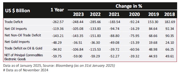 - India's merchandise trade deficit contracted to USD21.9bn in December 2024, a significant reduction from USD37.8bn in November 2024. Export earnings touched USD38.0bn, while imports stood at approximately USD60bn. The trade ministry recently revised import figures for precious metals, such as gold, after an earlier miscalculation overstated imports between April and November by USD 5 billion. Consequently, the trade deficit for that period was adjusted downward by USD13.6bn to USD188.8bn. In December 2024, gold imports amounted to USD4.7bn, while oil imports were valued at USD15.2bn.