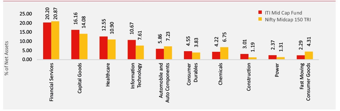 Past performance may or may not be sustained in future and is not a guarantee of any future returns, and should not be used as a basis of comparison with other investments. The performance data for 5 years period has not been provided, since scheme is in existence for less than 5 years. In case, the start / end date of the concerned period is a non-business date (NBD), the NAV of the previous date is considered for computation of returns. Different Plans i.e. Regular Plan and Direct Plan under the scheme have different expense structure. Benchmark: Nifty Midcap 150 TRI Additional Benchmark: Nifty 50 TRI. Fund Managers: Mr. Rohan Korde (Managing since 29-April-2022) and Mr. Dhimant Shah (Managing since 01-Oct-2022). Inception date of the scheme (05-Mar-2021). Face Value per unit: Rs. 10. Since the scheme is in existence for more than 3 years but less than 5 years hence performance data for 5 years is not provided. ITI Mid Cap Fund NAV as on January 31, 2025: Rs. 19.7469 (Regular Growth Option), Rs. 21.3982 (Direct Growth Option)