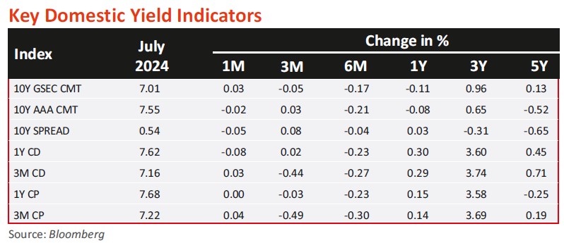 - Retail inflation (CPI) hit a four-month high of 5.08% in June 2024, up from 4.80% in May 2024, driven by a surge in food inflation to 9.4% owing to heatwaves. Food inflation rose to a 6-month high of 9.36%, with vegetable and pulse prices recording double-digit increase.