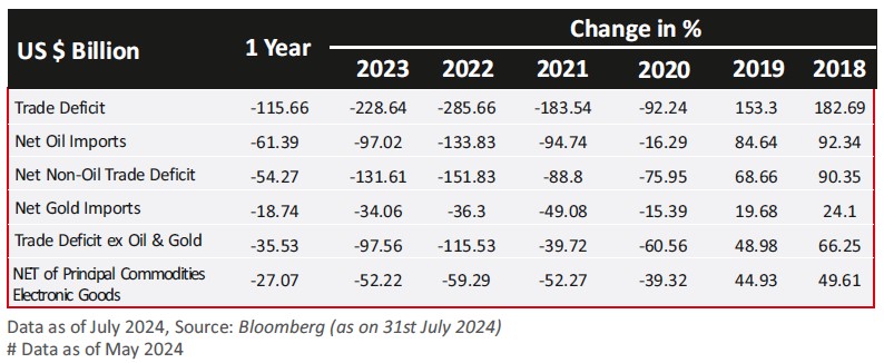 - India's merchandise trade deficit narrowed to USD20.98bn in June 2024 from USD23.78bn in May 2024, due to a larger fall in imports. June 2024 exports dropped 7.7% to USD35.20 bn, while imports fell 9.25% to USD56.18bn. Exports rose 2.6% YoY and imports increased 5% YoY. Major export growth drivers were engineering goods, electronic goods, and pharmaceuticals. India's total June 2024 exports (merchandise and services) were USD65.47 bn, up 5.40% from June 2023, while total imports were USD73.47bn, up 6.29%.