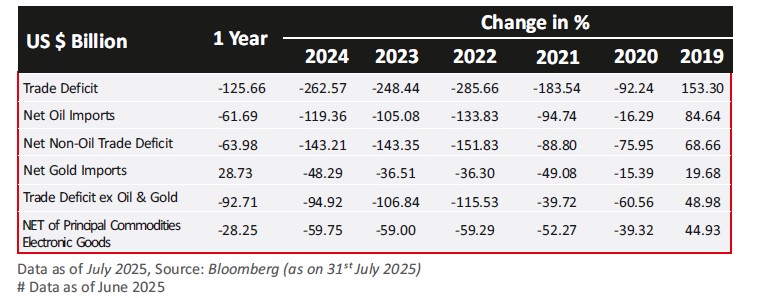 India's trade deficit in goods narrowed to USD18.78bn in June 2025 (USD21.88bn in May 2025) —the lowest in four months—as imports fell more sharply than exports, basis provisional data. Exports stood at USD35.14bn, while imports declined to USD53.92bn, aided by falling gold and crude oil prices. Gold imports dropped to USD1.8bn from USD2.5bn, and crude oil to USD13.7bn from USD14.7bn. Total exports, including services, rose 6.5% to USD67.98bn, while overall imports edged up by 0.5% to USD71.50bn. This reduced the overall trade deficit to USD3.51 billion, down from USD7.30 billion in June 2024. Despite this monthly improvement, the April–June 2025 merchandise deficit widened year-on-year to USD67.26bn, though cumulative exports rose nearly 6% to USD210.31bn in the same period.