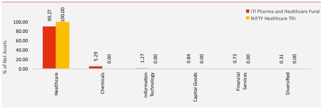 Past performance may or may not be sustained in future and is not a guarantee of any future returns, and should not be used as a basis of comparison with other investments. The performance data for 5 years period has not been provided, since scheme is in existence for less than 5 years. In case, the start / end date of the concerned period is a non-business date (NBD), the NAV of the previous date is considered for computation of returns. Different Plans i.e. Regular Plan and Direct Plan under the scheme have different expense structure. Benchmark: Nifty Healthcare TRI Additional Benchmark: Nifty 50 TRI. Fund Managers: Mr. Rohan Korde (Managing since 08-Nov-21) and Mr. Dhimant Shah (Managing since 01-December-22). Inception date of the scheme is (08-Nov-2021). Face Value per unit: Rs. 10.ITI Pharma & Healthcare Fund NAV as on July 31, 2025: Rs. 16.7605 (Regular Growth Option), Rs. 18.0797 (Direct Growth Option)