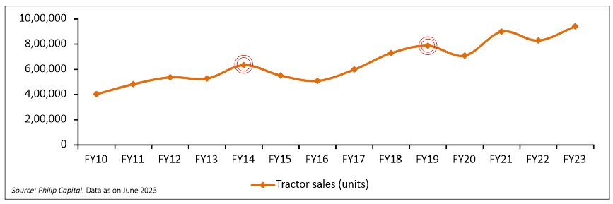 - Tractor sales tend to make new highs in the year of Loksabha Elections: Tractor unit sales over the last two Loksabha Elections (held in 2014 & 2019) point towards an interesting trend. They tend to make a “new high” in the year of Loksabha Elections. Considering the impending elections in 2024, we can expect a similar trend in this financial year as well.