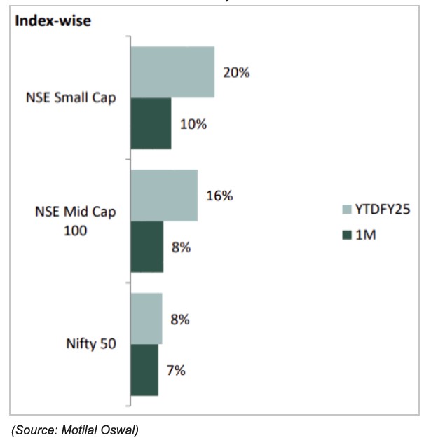 (+8%) were the top gainers, whereas PSU Banks (-0.3%) was the only laggard MoM. Shriram Finance (+24%), Ultratech (+18%), Wipro (+17%), TechM (+16%), and Grasim (+15%) were the top performers, while Adani Ent. (-7%), Coal India (-4%), L&T (-3%), BPCL (-3%), and Maruti (-3%) were the key laggards.