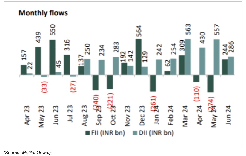 FIIs turned buyers of USD3.1b in Jun'24, after remaining net sellers for two months. DIIs recorded inflows of USD3.4b in Jun'24 after clocking USD6.7b of inflows in May'24. FII inflows into Indian equities stand at USD0.3b in CY24YTD vs. inflows of USD21.4b in CY23. DII inflows into equities in CY24YTD continue to be strong at USD28.5b vs. USD22.3b in CY23.