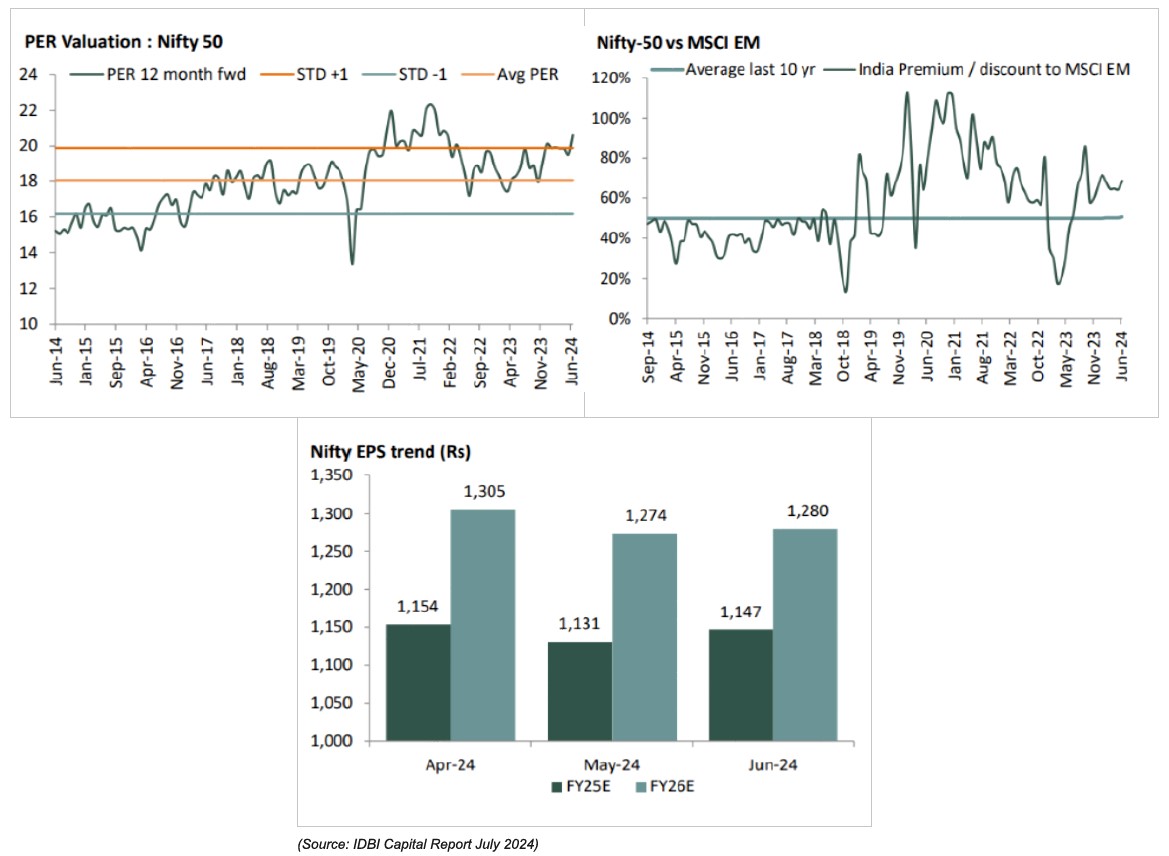 At the present level of valuations, the valuations of NIFTY is above the 1-year forward earnings of last 10 years. NIFTY is also trading at a premium to MSCI EM (Morgan Stanley Capital International Emerging Market) in terms of valuations. Earnings growth expectations in FY25-26E remains strong, with expectation of 12% pa in FY25E and FY26E.
