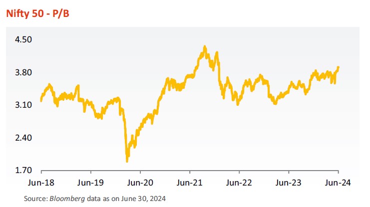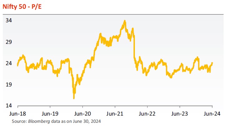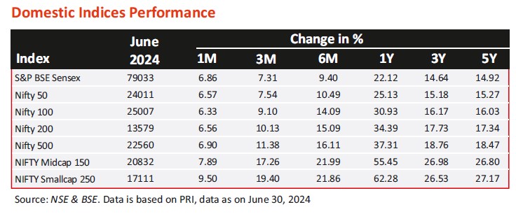 - June 2024 saw a volatile market triggered by election results. Markets moved higher on expectations of policy continuity even as the mandate was not as expected. The S&P BSE Sensex and Nifty 50 surged by 6.8% and 6.6% respectively in June 2024. The S&P BSE MidCap and the S&P BSE Smallcap jumped 7.7% and 10.3% respectively. FIIs bought (net) equities worth Rs 26,565 crores with DIIs (Domestic Institutional Investor) clocking net equity purchases worth Rs 28,633 crores.