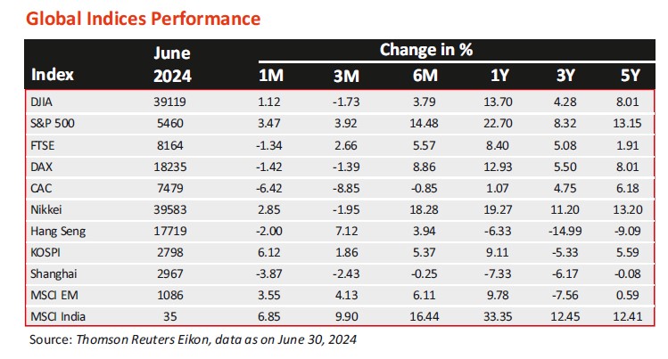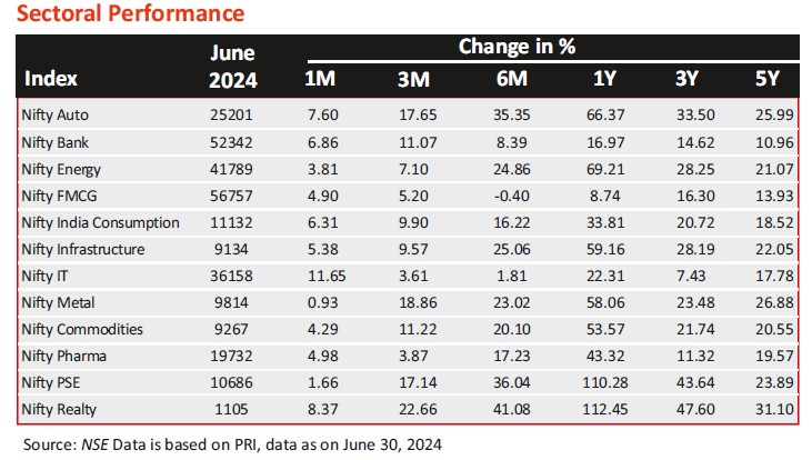 - On the S&P BSE sectorial front, the leading performers in June 2024 were S&P BSE IT (up 11.3%), S&P BSE Teck (9.5%) and S&P BSE Realty (8.2%).