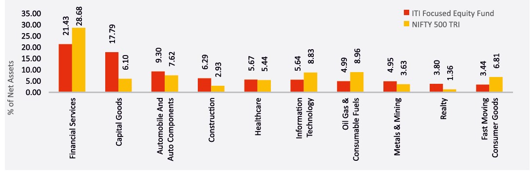Past performance may or may not be sustained in future and is not a guarantee of any future returns, and should not be used as a basis of comparison with other investments. Different Plans i.e. Regular Plan and Direct Plan under the scheme have different expense structure. Benchmark: Nifty 500 TRI Additional Benchmark: Nifty 50 TRI. Fund Managers: Mr. Dhimant Shah (Managing since 19-June-2023) and Mr. Rohan Korde (Managing since 19-June-2023). Inception date of the scheme is (19-June-23). Face Value per unit: Rs. 10. Simple annualized returns have been provided as per the extant guidelines since the scheme has completed 6 months but not 1 year. ITI Focused Equity Fund NAV as on June 28, 2024: Rs. 14.3913 (Regular Growth Option), Rs. 14.6804 (Direct Growth Option)