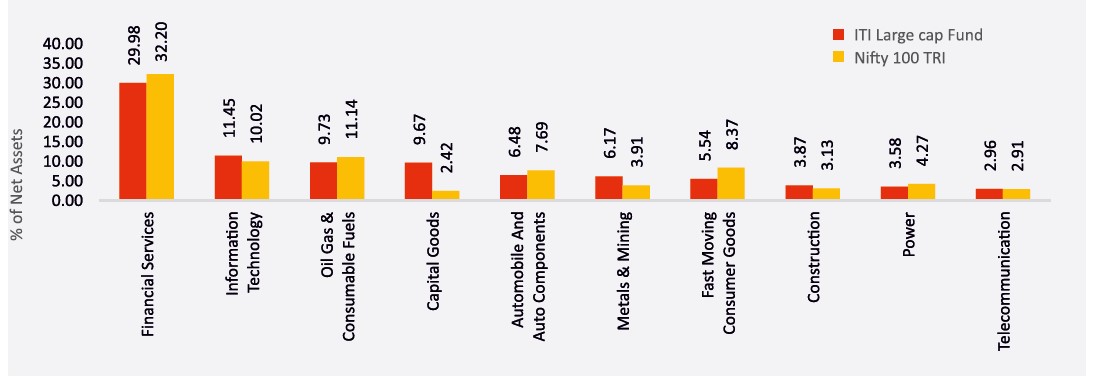 Past performance may or may not be sustained in future and is not a guarantee of any future returns, and should not be used as a basis of comparison with other investments. The performance data for 5 years period has not been provided, since scheme is in existence for less than 5 years. In case, the start / end date of the concerned period is a non-business date (NBD), the NAV of the previous date is considered for computation of returns. Different Plans i.e. Regular Plan and Direct Plan under the scheme have different expense structure. Benchmark: Nifty 100 TRI Additional Benchmark: Nifty 50 TRI. Fund Managers: Mr Rajesh Bhatia (Managing Since 01-Jan-2024), Mr Rohan Korde (Managing Since 01-Jan-2024) and Mr. Vishal Jajoo (Managing Since 01-Jan-2024) . Inception date of the scheme (24-Dec-20). Face Value per unit: Rs. 10. ITI Large Cap Fund NAV as on June 28, 2024: Rs. 17.8784 (Regular Growth Option), Rs. 19.2657 (Direct Growth Option)