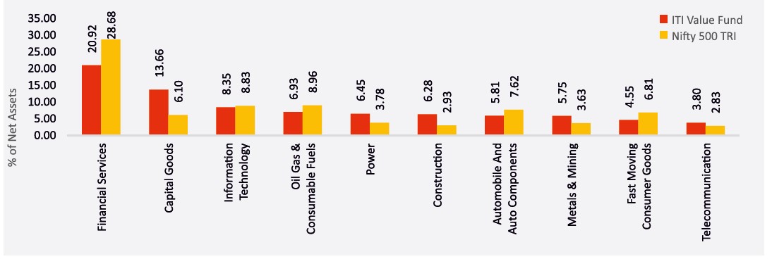 Past performance may or may not be sustained in future and is not a guarantee of any future returns, and should not be used as a basis of comparison with other investments. The performance data for 3 years period has not been provided, since scheme is in existence for less than 3 years. In case, the start / end date of the concerned period is a non-business date (NBD), the NAV of the previous date is considered for computation of returns. Different Plans i.e. Regular Plan and Direct Plan under the scheme have different expense structure. Benchmark: Nifty 500 TRI Additional Benchmark: Nifty 50 TRI. Fund Managers: Mr. Rohan Korde (Managing since 14-Jun-21) and Mr. Dhimant Shah (Managing since 01-December-2022). Inception date of the scheme (14-June-2021). Face Value per unit: Rs. 10. ITI Value Fund NAV as on June 28, 2024: Rs. 17.2420 (Regular Growth Option), Rs. 18.3749 (Direct Growth Option)