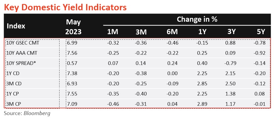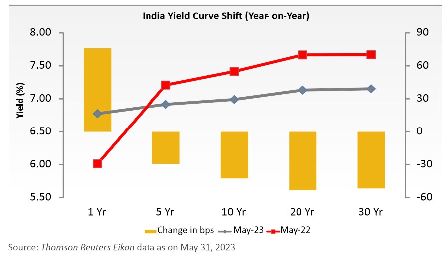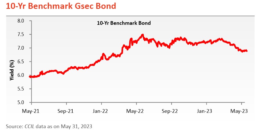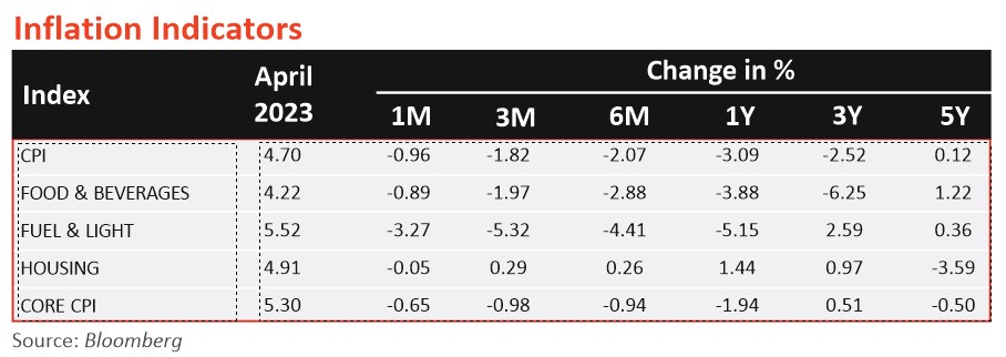 India’s retail inflation (CPI) eased to an 18-month low of 4.77% in April 2023 (5.66% in March 2023). CPI remained within the tolerance range of the RBI for the second consecutive month. The consumer food price index (CFPI) eased to 3.84% in April 2023, as against 4.79% in March 2023, playing a pivotal role in taming CPI. Rural inflation in April 2023 stood at 4.68% and urban inflation came at 4.85%.