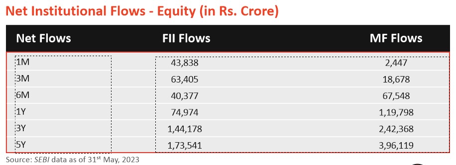 Markets sustained the rally in May 2023 on the back of strong FII buying (Rs 43,838 crores) even as DIIs turned (net) sellers to the tune of Rs 3,306 crores. While there was no formidable rallying point, lower-than-expected inflation, a pause on rate hikes, absorption of full year’s earnings and encouraging performance of certain sectors, continue to showcase India as a bright spot in emerging markets.