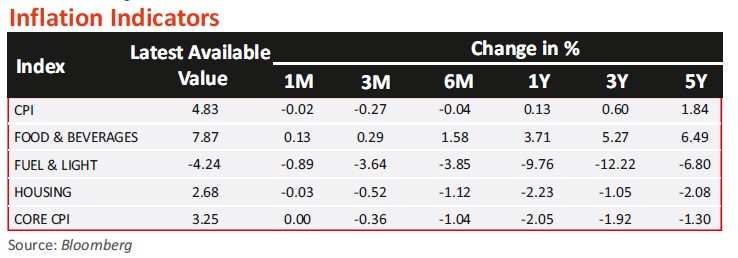 • CPI (retail) inflation decreased slightly to 4.8% in April 2024, an 11-month low, from 4.9% in March 2024. This reduction was primarily due to greater deflation in the fuel and light segment and lower inflation rates for clothing and footwear, and pan, tobacco, and intoxicants. Retail inflation in urban areas was lower than the national average of 4.11% and higher in rural India at 5.43%.