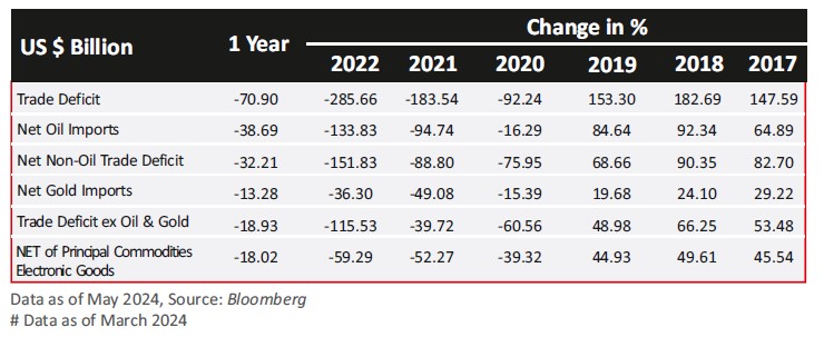 • The combined eight core sectors grew by 6.2% in April 2024, (6% in March 2024), driven by strong electricity (9.4%) and steel (7.1%) output. Coal and natural gas production also increased, while fertilisers saw a 0.8% decline. The growth momentum is the fastest since December 2023 and is expected to support overall industrial output.