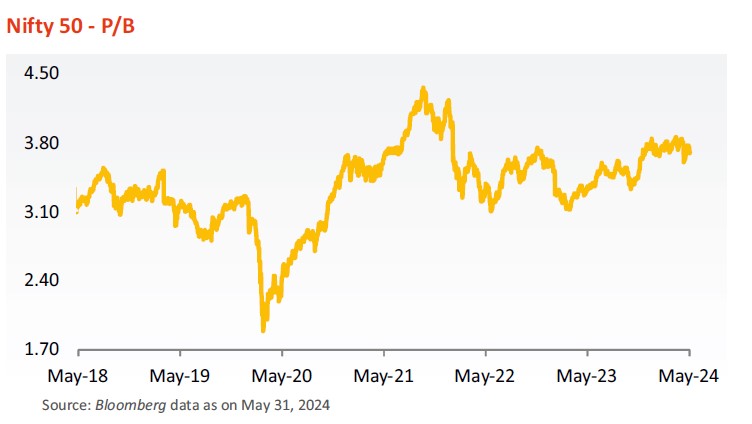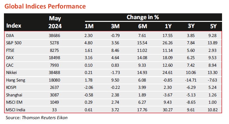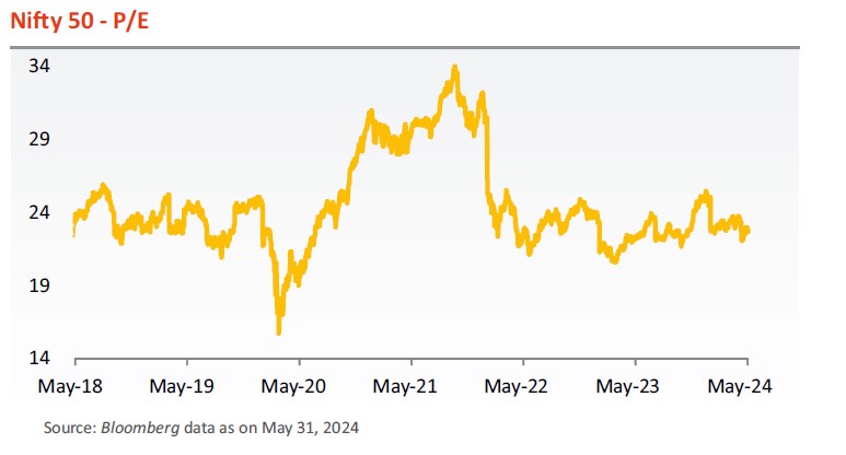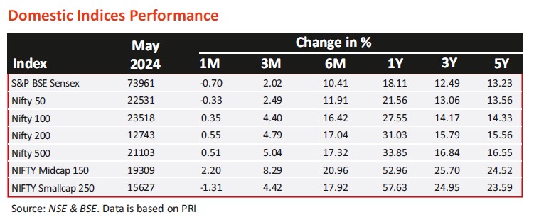 - May 2024 saw a flat market, albeit with intermittent volatility, under the shadow of general elections. S&P BSE Sensex and Nifty 50 closed lower by 0.7% and 0.3% respectively in May 2024. The S&P BSE MidCap was an exception rising by 1.7% with the S&P BSE SmallCap ending flat (-0.1%). FIIs sold (net) equities worth Rs 25,586 crores with DIIs clocking net equity purchases worth Rs 55,733 crores.