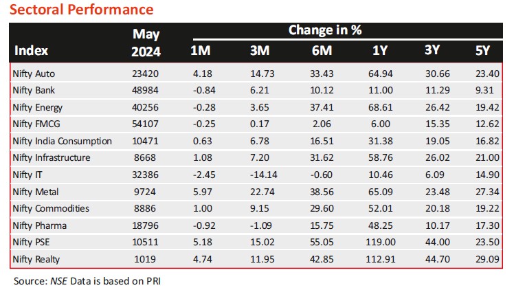 - On the S&P BSE sectorial front, the leading performers in May 2024 were S&P BSE CG (up 11.2%), S&P BSE Power (6.6%) and S&P BSE Metal (4.7%), while S&P BSE Oil & Gas (down 1.2%) and S&P BSE HC (-1.5%) S&P BSE IT (-2.6%) were the laggards.