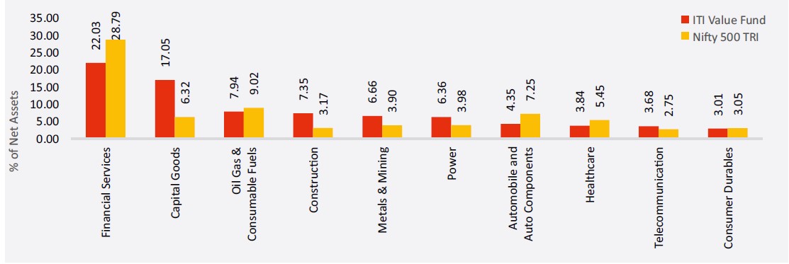 Past performance may or may not be sustained in future and is not a guarantee of any future returns, and should not be used as a basis of comparison with other investments. The performance data for 3 years period has not been provided, since scheme is in existence for less than 3 years. In case, the start / end date of the concerned period is a non-business date (NBD), the NAV of the previous date is considered for computation of returns. Different Plans i.e. Regular Plan and Direct Plan under the scheme have different expense structure. Benchmark: Nifty 500 TRI Additional Benchmark: Nifty 50 TRI. Fund Managers: Mr. Rohan Korde (Managing since 14-Jun-21) and Mr. Dhimant Shah (Managing since 01-December-2022). Inception date of the scheme (14-June-2021). Face Value per unit: Rs. 10. ITI Value Fund NAV as on May 31, 2024: Rs. 16.0186 (Regular Growth Option), Rs. 17.0197 (Direct Growth Option)