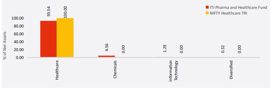 Past performance may or may not be sustained in future and is not a guarantee of any future returns, and should not be used as a basis of comparison with other investments. The performance data for 5 years period has not been provided, since scheme is in existence for less than 5 years. In case, the start / end date of the concerned period is a non-business date (NBD), the NAV of the previous date is considered for computation of returns. Different Plans i.e. Regular Plan and Direct Plan under the scheme have different expense structure. Benchmark: Nifty Healthcare TRI Additional Benchmark: Nifty 50 TRI. Fund Managers: Mr. Rohan Korde (Managing since 08-Nov-21) and Mr. Dhimant Shah (Managing since 01-December-22). Inception date of the scheme is (08-Nov-2021). Face Value per unit: Rs. 10. ITI Pharma & Healthcare Fund NAV as on May 30, 2025: Rs. 15.9141 (Regular Growth Option), Rs. 17.1119 (Direct Growth Option)