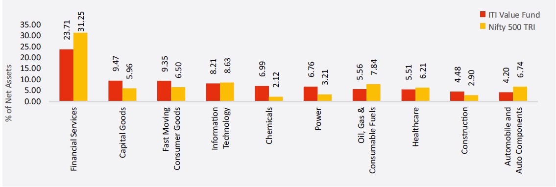 Past performance may or may not be sustained in future and is not a guarantee of any future returns, and should not be used as a basis of comparison with other investments. The performance data for 5 years period has not been provided, since scheme is in existence for less than 5 years. In case, the start / end date of the concerned period is a non-business date (NBD), the NAV of the previous date is considered for computation of returns. Different Plans i.e. Regular Plan and Direct Plan under the scheme have different expense structure. Benchmark: Nifty 500 TRI Additional Benchmark: Nifty 50 TRI. Fund Managers: Mr. Rohan Korde (Managing since 14-Jun-21) and Mr. Dhimant Shah (Managing since 01-December-2022). Inception date of the scheme (14-June-2021). Face Value per unit: Rs. 10. ITI Value Fund NAV as on May 30, 2025: Rs. 16.2915 (Regular Growth Option), Rs. 17.6571 (Direct Growth Option)