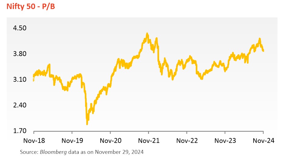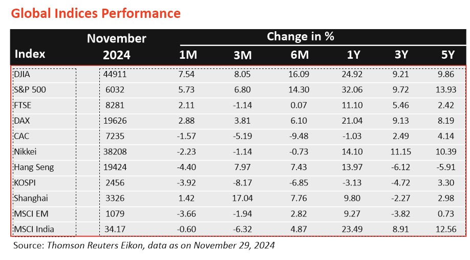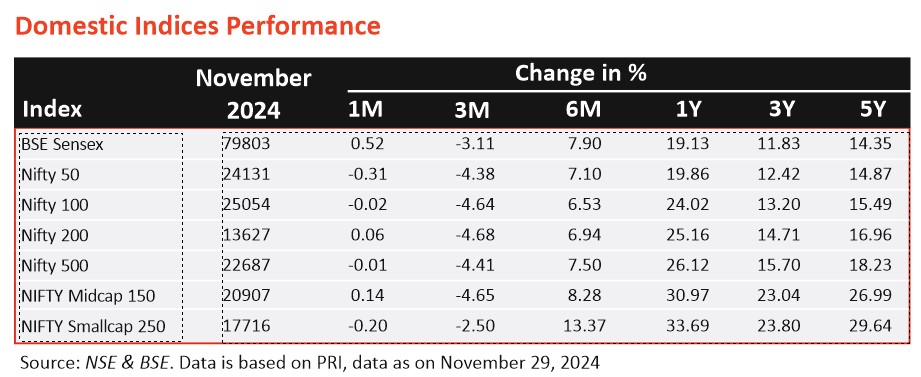 - Equity markets in November 2024 were influenced by quarterly results and the US presidential elections. Factors like low government spending, elections, and a weak monsoon dampened market sentiment.