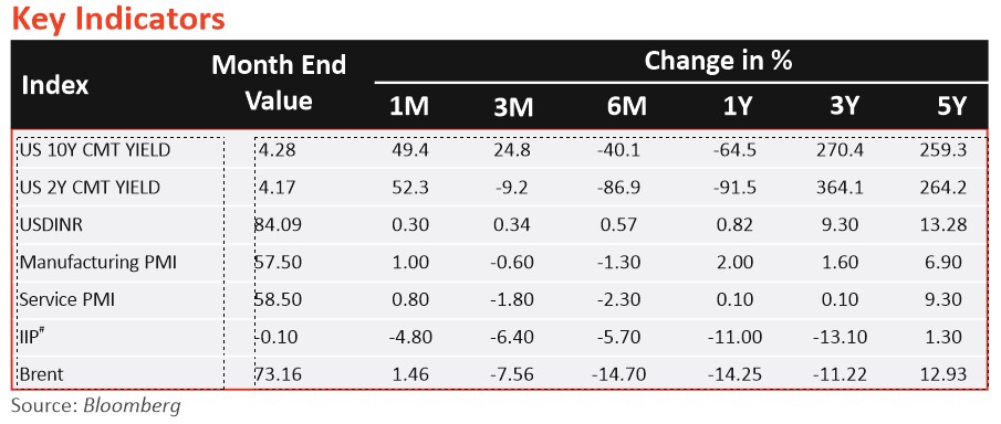 - Wholesale inflation (WPI) rose to 1.84% in September 2024 from 1.31% in August 2024, driven by a surge in food prices. Primary food articles' inflation hit a 14-month high of 11.5%. This marks a shift from the -0.1% deflation in September 2023. Despite an overall negative wholesale inflation (-0.7%) in FY24, prices have stayed above 1% since April, with deflation in seven out of the 12 months.