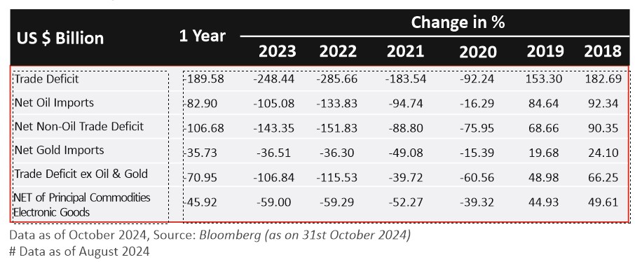 - India’s merchandise trade deficit for September 2024 was USD20.8bn (USD29.7bn in August 2024), driven by a steep fall in gold imports from USD10.1bn in August 2024 to USD4.4bn. Merchandise exports fell slightly to USD34.6bn, while imports dropped sharply to USD55.4bn. Services exports and imports remained steady at approximately USD30.6bn and USD16.3bn, respectively.