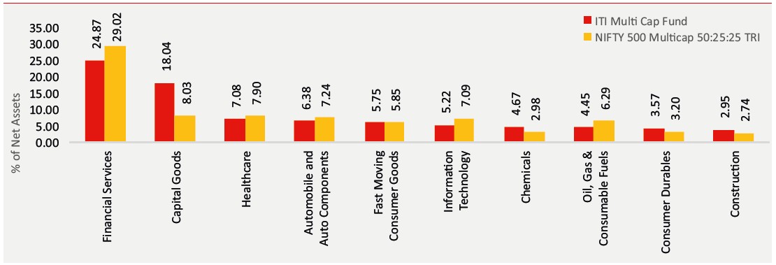 Past performance may or may not be sustained in future and is not a guarantee of any future returns, and should not be used as a basis of comparison with other investments. In case, the start / end date of the concerned period is a non-business date (NBD), the NAV of the previous date is considered for computation of returns. Different Plans i.e. Regular Plan and Direct Plan under the scheme have different expense structure. Benchmark: Nifty 500 Multicap 50:25:25 TRI Additional Benchmark: Nifty 50 TRI. Fund Managers: Mr. Dhimant Shah (Managing since 08-August-2022) and Mr. Rohan Korde (Managing Since 01-December-2022) Inception date of the scheme (15-May-19). Face Value per unit: Rs. 10. ITI Multi Cap Fund NAV as on October 31, 2025: Rs. 23.8421 (Regular Growth Option), Rs. 27.0515 (Direct Growth Option)