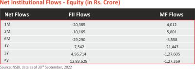 July and August 2022 market rally was snapped in September as FIIs, who came in strongly over last couple of months, began receding on US Fed rate hike anticipation, a stronger dollar, and slowdown concerns.