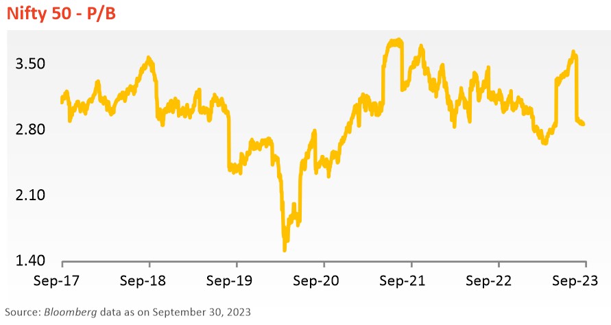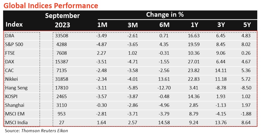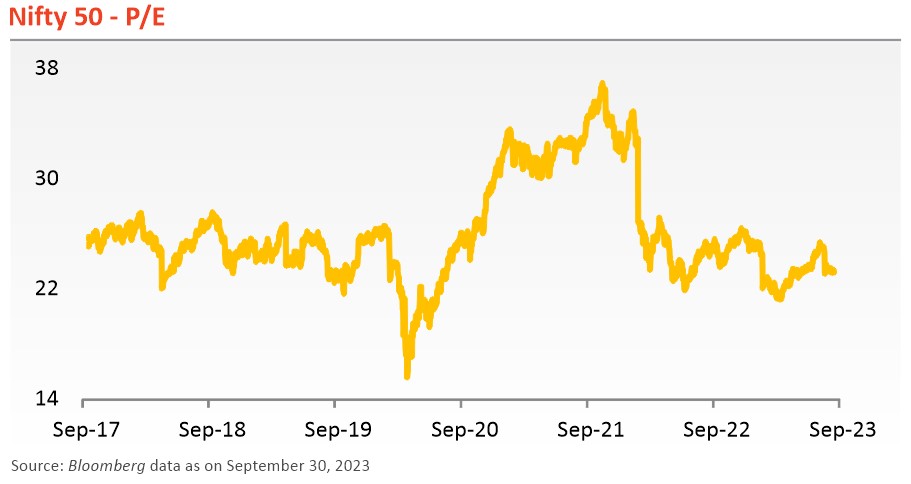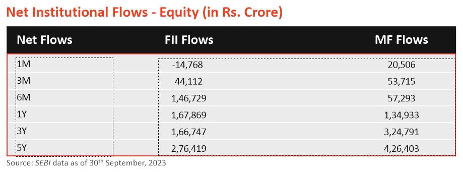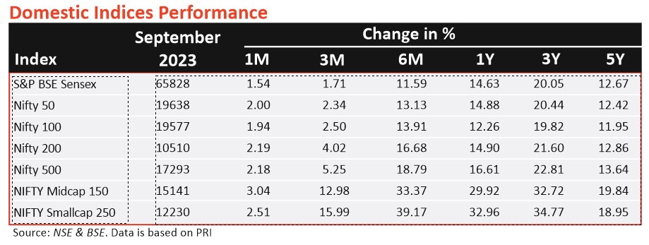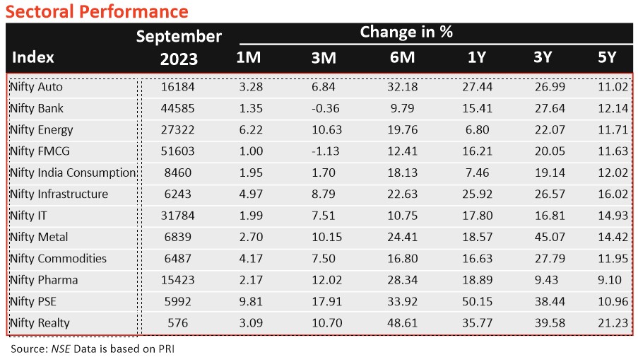 Markets in September 2023 maintained a general uptrend. However, there were some profit bookings from higher levels across segments especially in midcaps and smallcaps. Conditions in US Markets (sticky inflation and higher yields) triggered selling by foreign institutions. FIIs were net sellers (Rs 14,768 crores) while DIIs were net buyers (Rs 20,313 crores).